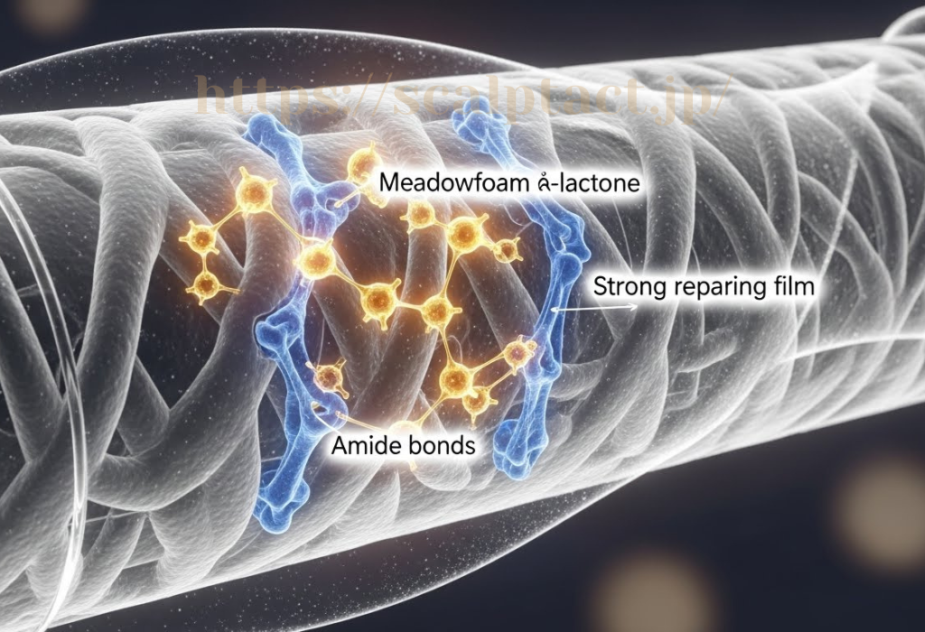 これを「アミド結合」と呼び、シャンプーをしても流れ落ちにくい強固な補修膜を作ります。
